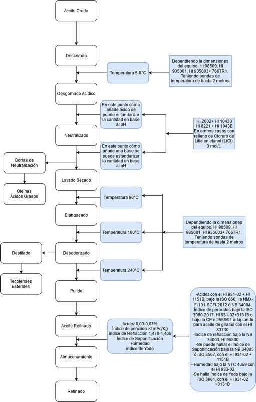 Se evidencia que en el proceso de obtención del aceite tanto crudo cómo refinado, Hanna Instruments puede colaborar con la medición de Humedad, Acidez, Temperatura, pH, Índice de peróxido, Índice de refracción, Índice de Yodo e Índice de saponificación. Sugiriendo las normas nacionales e internacionales, con las cuales se puede realizar el uso de los equipos mencionados. Observando que todos pueden medir dentro del rango solicitado para el tipo de proceso.