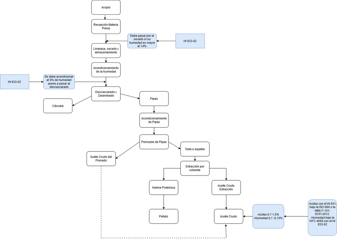Acondicionamiento de la humedad, descascarado, prensado: La semilla se transporta a la planta de proceso, donde se acondiciona, lo que incluye limpiarla de impurezas (si no se hizo en la recepción) y secarla hasta alcanzar una humedad de alrededor del 6% sugiriendo el HI933-02,