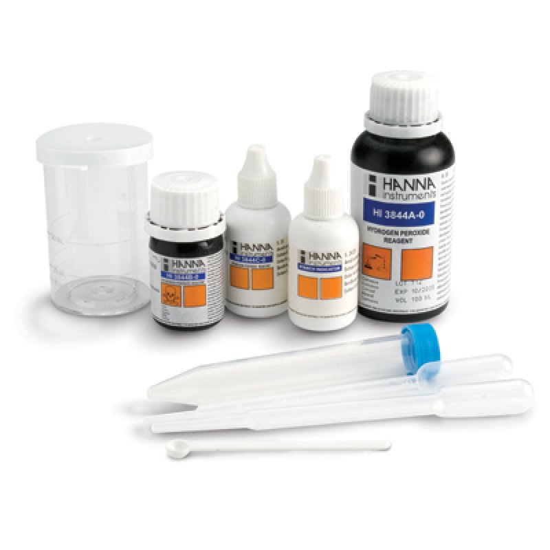 - El kit de pruebas HI 3844 viene con 100 mL de reactivo de peróxido de hidrógeno A, 17 g de reactivo de peróxido de hidrógeno B, 30 mL de reactivo de peróxido de hidrógeno C, 25 mL de reactivo de peróxido de hidrógeno D, tubo de ensayo plástico graduado con tapa, vaso plástico calibrado de 50 mL, pipeta plástica de 3 mL, pipeta plástica de 1 mL y cuchara plástica.