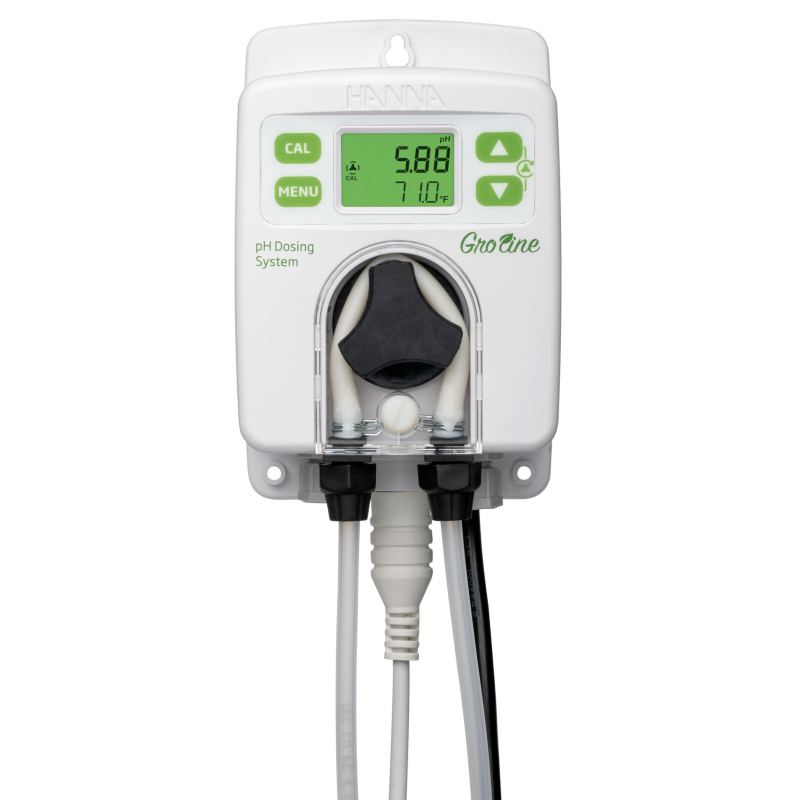 El sistema dosificador para pH HI981412 está diseñado para mantener el pH de soluciones nutritivas y aguas de riego. El pH de estas soluciones es fundamental para la propagación y el crecimiento exitosos de los cultivos. Por lo general, las plantas prefieren una solución ligeramente ácida por el efecto sobre la solubilidad de nutrientes y las bacterias que viven en las raíces. El HI 981412 fue desarrollado como una solución económica para que el horticultor mantenga el pH ideal en todo momento. Simplemente inserte la sonda y la válvula de inyección en línea con la bomba de recirculación y proporcione el químico a dosificar.