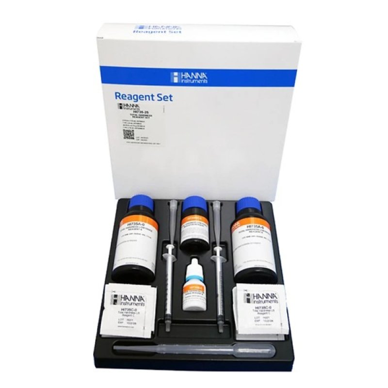 Los HI735-25 son reactivos de alta calidad que se miden previamente, lo que permite a los usuarios lograr mediciones rápidas y precisas con su comprobador de rango bajo de dureza total - Checker®HC. Estos reactivos siguen el método DPD en el que la reacción entre el cloro y el reactivo provoca un tinte rojo violeta en la muestra. Simplemente agregando el paquete de reactivo HI735-25 a la muestra, la reacción tendrá lugar y el HI735 determinará la concentración a partir del color que se produce. Los resultados se mostrarán en ppm (mg/L). Estos reactivos están diseñados para usarse con muestras que tienen un rango esperado de 0 a 350 ppm (mg/L) como CaCO 3.