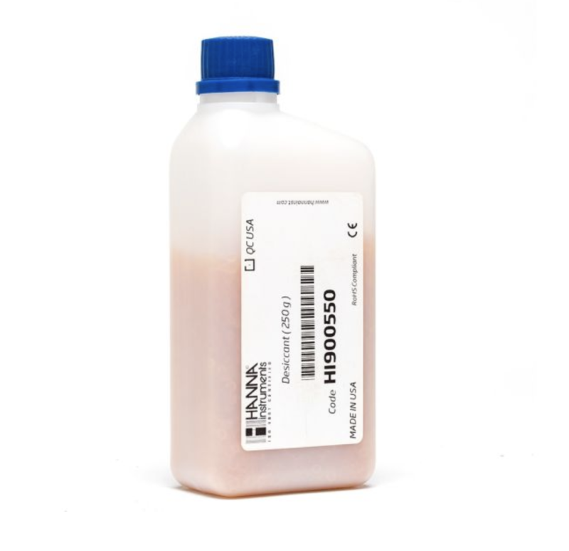 El HI900550 viene con 250 gramos de desecante de sílice en gel, indicador de color, para el Sistema de Titulación Karl Fischer HI903. El gel de sílice indicador de color, recargable evita la entrada de humedad ambiental en el sistema sellado. Su cambio de color le permite al usuario reconocer cuándo se ha agotado su capacidad de adsorción.