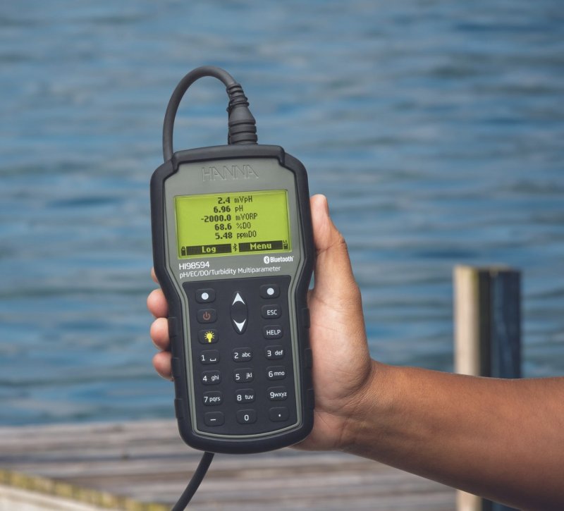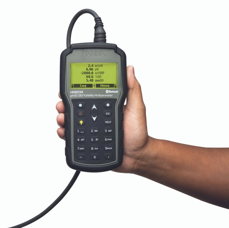 El HI98594 es un sistema portátil multiparámetro de registro (medidor y sonda) que monitorea hasta 14 parámetros diferentes de calidad del agua (7 medidos y 7 calculados), como pH, ORP, turbidez, conductividad, oxígeno disuelto y temperatura. El HI98594 cuenta con una pantalla gráfica retroiluminada que ajusta automáticamente el tamaño de los dígitos para adaptarse a la pantalla y permite la visualización de gráficos en pantalla. Cada parámetro es totalmente configurable.
